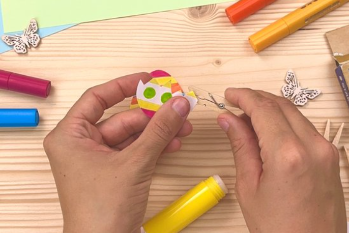 Tipp: Ha szeretnél egy kis meglepetést is belecsempészni, ragassz egy apró csibét vagy nyuszit a tojás alsó fele mögé.